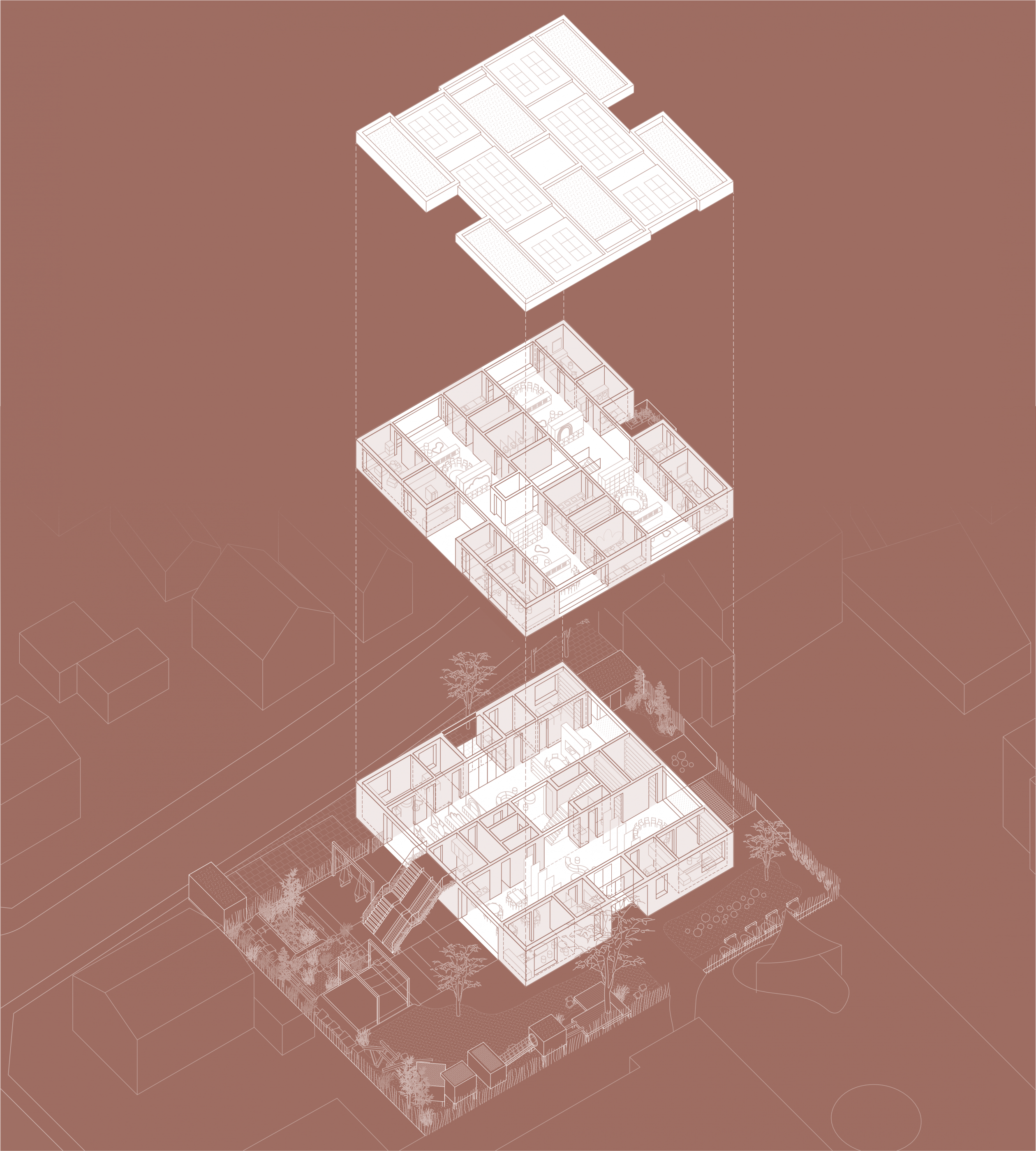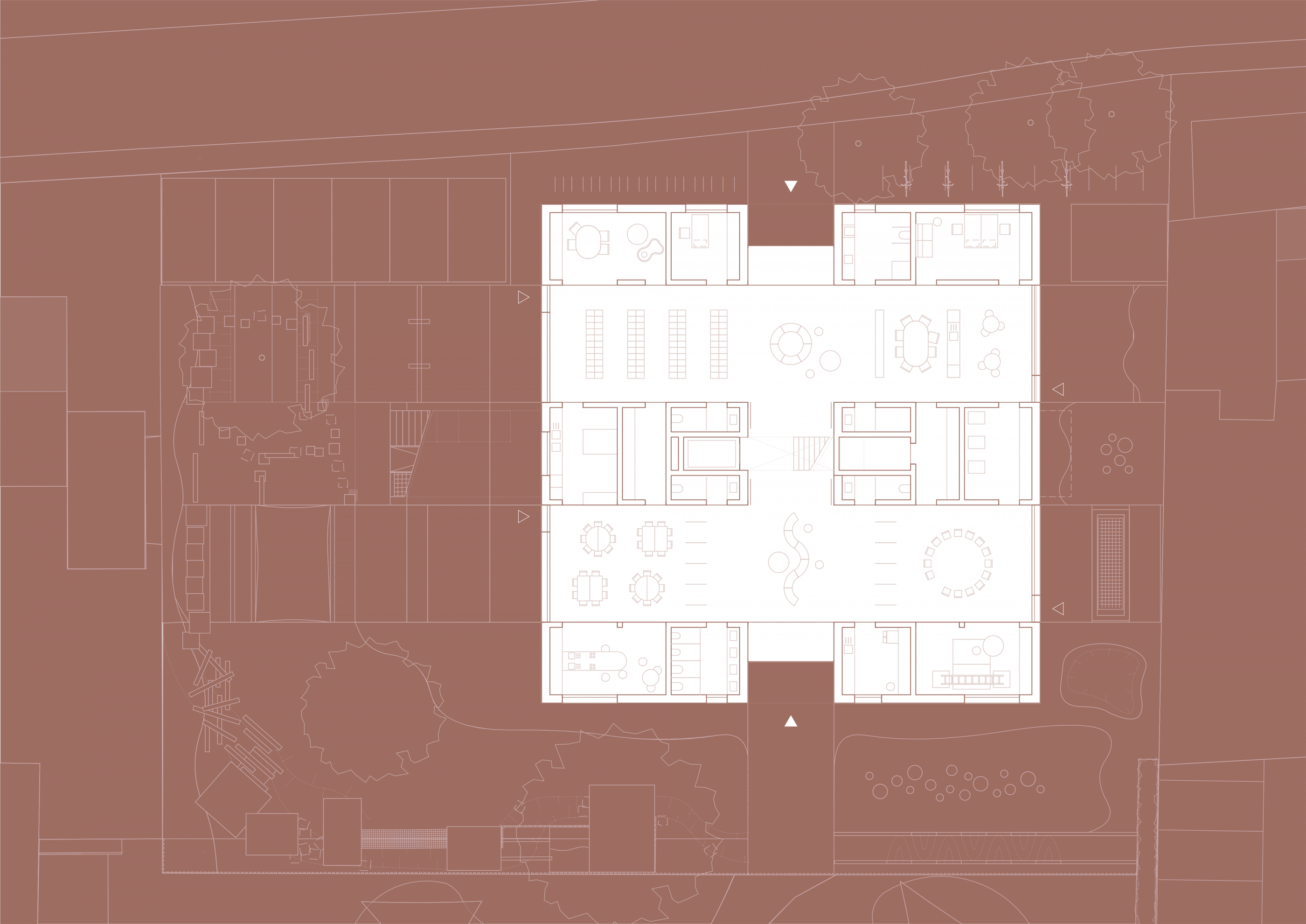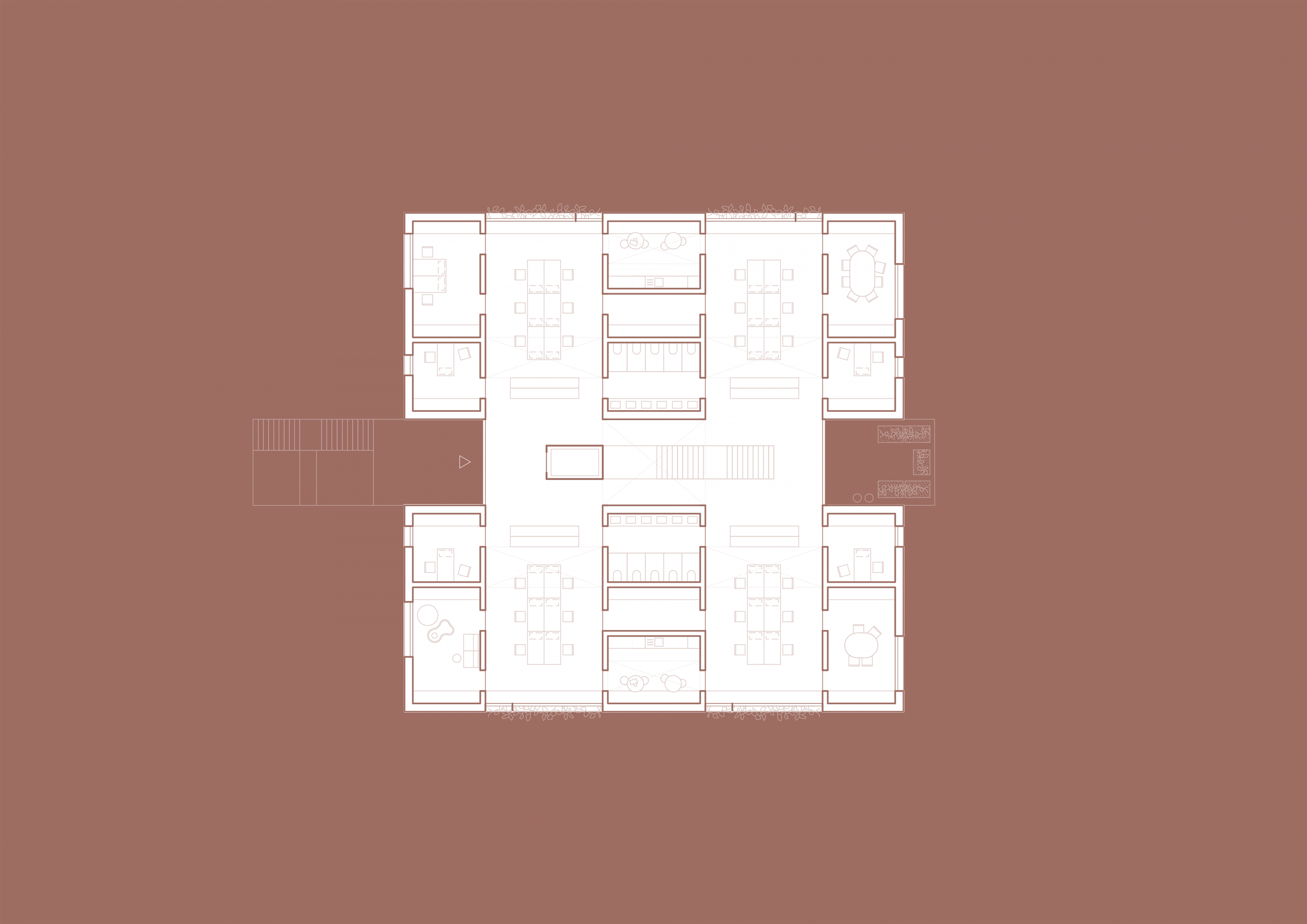 Zwei weitere Achsen prägen den Grundriss. Senkrecht zur Haupterschließung segmentieren sie das Volumen und erschließen die Nutzungseinheiten. Das „Haus aus Häusern“ bezieht sich damit auf die städtebauliche Körnung der Nachbarschaft, ohne seine Verwandtschaft mit Flachdach zu den umgebenden öffentlichen Gebäuden zu leugnen. Dank großzügiger Transparenz nach Innen und Außen entstehen grenzenlos fließende Räume.