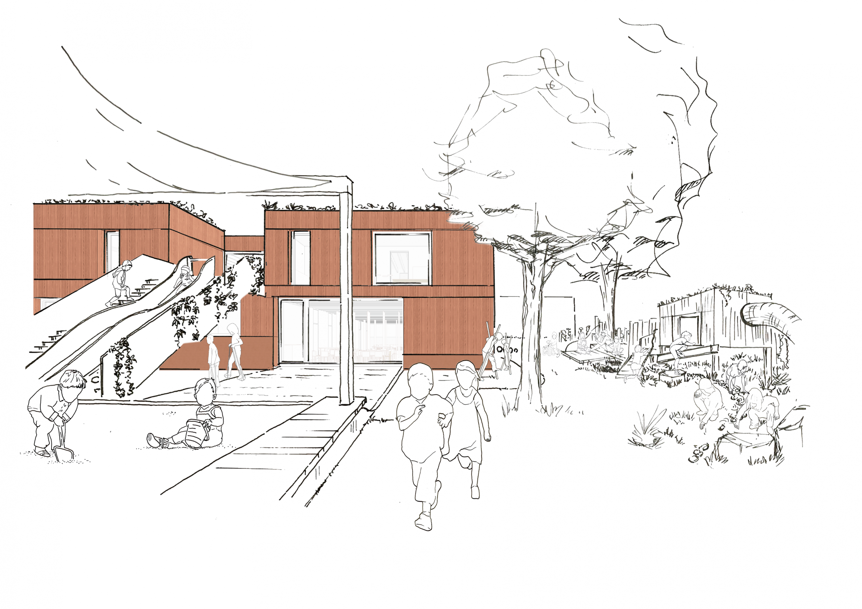 Die Freiräume am Kindergarten Wolkenschloss sind wesentliche Spiel- und Entfaltungsräume , die zur gesunden Entwicklung der Kinder beitragen. Der Garten ist Wohlfühlraum und bietet idealerweise Potenzial für die freie Entfaltung und das Bestimmen eigener Spiele. Da Naturerfahrung dabei eine große Rolle spielt, enthält der Garten für Kinder neben Einrichtungselementen wie zum Beispiel Spielhütten mit Dachbegrünung, Dreh- und Wackelkugeln, Balancierwürfel und -balken und Schwingen, unterschiedliche Pflanzungen als natürliche Spiel- und Versteckmöglichkeiten. Es entsteht der Charakter eines Gartens, der Bezug auf das Gebäude nimmt und anspruchsvolle und multifunktionale Bewegungs- und Begegnungsangebote landschaftlich ergänzt. Vielseitige Spielwege durch Gräben und über Brücken hinein in Spiel- und Rückzugsorte, die auch ökologischen Nutzen wie Retentionsflächen, Schutz für Baumwurzeln sowie Lebens- und Nahrungsraum für Insekten beinhalten, werden definiert. Holzbalken, Bruchsteine und Modellierungen ermöglichen dezentrales Spielen. Die Trampolinarena wird dem Bewegungsraum innen zugeordnet und erweitert den Aktionsraum und ermöglicht eine eigene, kleine Bewegungswelt für individuelle Bewegungsspiele und -übungen. Dem Bistro ist eine große Terrasse zugeordnet, wodurch der Innenraum nach Außen vergrößert wird. Der Terrasse grenzt eine offene Spielfläche für freies Spielen und Toben an. Dazu werden Rundwege zum Rennen und Rollen für mehr Spannung in Teilen in sanften Wellen ausgeführt entwickelt. Der klassische Sandspielbereich mit experimentellem Charakter wird lebendig eingefasst. Die erhöhte Einfassung aus unterschiedlichen Materialien dient als Balancierstrecke, Sitzkante und Erfahrungsort in Einem. Durch eine Pergola wird der Bereich auch an sonnigen Tagen nutzbar gemacht und mit Schatten versorgt. So entsteht ein Rückzugsort zum Sandburgenbauen. Der Garten benötigt einen geschützten Stauraum und Abfallstellflächen sowie ein Bobbycar-Parkhaus, welches sich die Kita mit der Nachbar-Kita teilt, die ebenfalls jeweils eine Dachbegrünung erhalten. Die PKW-Stellflächen erhalten wasserdurchlässige Pflastersteine und im Eingangsbereich wird ausreichend Stellfläche für (Lasten-)Fahrräder, Fahrradanhänger und Roller vorgesehen. Insgesamt wird der Eingangsbereich offen gestaltet und das Außengelände erhält eine in Teilen berankte Holzeinfriedung zu den Parkplätzen und zur benachbarten Kita.