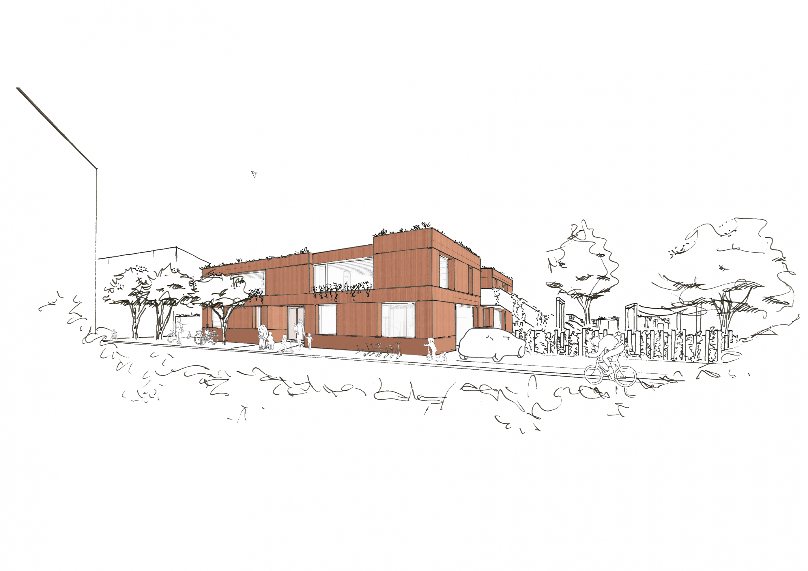 Mit einer klaren Tragwerksstruktur bestehend aus Holzrahmenwänden, -stützen, -balkendecken und -fassade setzt das Projekt auf einen nachwachsenden Rohstoff. Die rot-braune Fassadenverkleidung in wilder Nut-Feder Verschalung mit tiefen Fensterlaibungen stellt bewusst Bezüge zu Schriesheims Wahrzeichen, der Strahlenburg auf. Die Belegung der Dachflächen mit PV-Anlage, Begrünung auch an Fassade runden das nachhaltige Konzept im Sinne einer Schwammstadt ab. Regenwasser soll weitergenutzt werden oder auf dem Grundstück versickern.