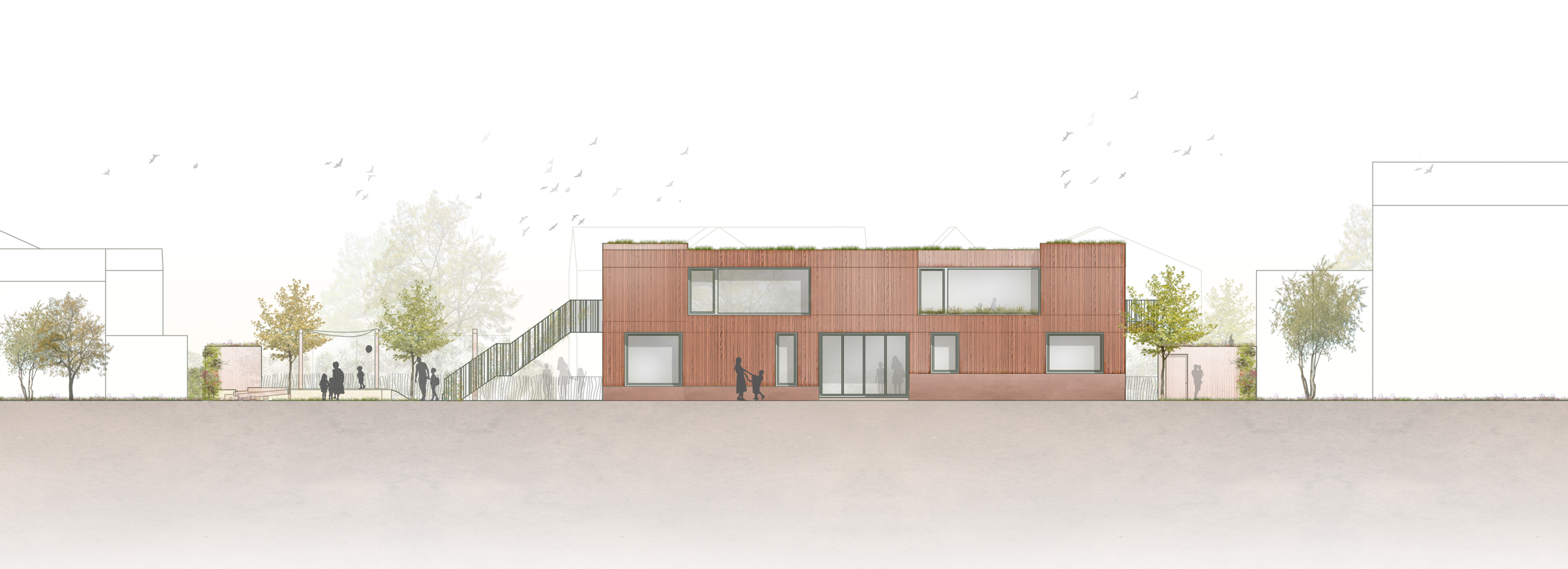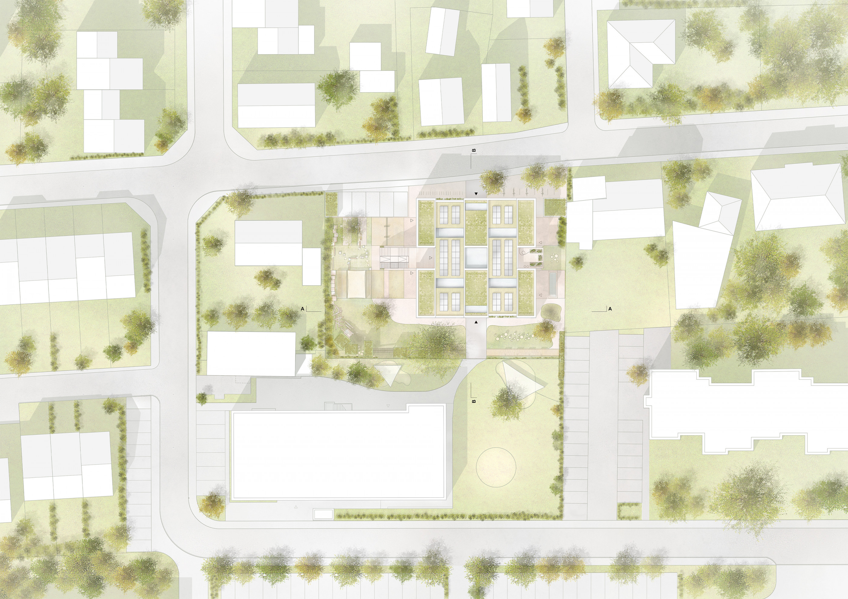 Die Freiräume am Kindergarten Wolkenschloss sind wesentliche Spiel- und Entfaltungsräume , die zur gesunden Entwicklung der Kinder beitragen. Der Garten ist Wohlfühlraum und bietet idealerweise Potenzial für die freie Entfaltung und das Bestimmen eigener Spiele. Da Naturerfahrung dabei eine große Rolle spielt, enthält der Garten für Kinder neben Einrichtungselementen wie zum Beispiel Spielhütten mit Dachbegrünung, Dreh- und Wackelkugeln, Balancierwürfel und -balken und Schwingen, unterschiedliche Pflanzungen als natürliche Spiel- und Versteckmöglichkeiten. Es entsteht der Charakter eines Gartens, der Bezug auf das Gebäude nimmt und anspruchsvolle und multifunktionale Bewegungs- und Begegnungsangebote landschaftlich ergänzt. Vielseitige Spielwege durch Gräben und über Brücken hinein in Spiel- und Rückzugsorte, die auch ökologischen Nutzen wie Retentionsflächen, Schutz für Baumwurzeln sowie Lebens- und Nahrungsraum für Insekten beinhalten, werden definiert. Holzbalken, Bruchsteine und Modellierungen ermöglichen dezentrales Spielen. Die Trampolinarena wird dem Bewegungsraum innen zugeordnet und erweitert den Aktionsraum und ermöglicht eine eigene, kleine Bewegungswelt für individuelle Bewegungsspiele und -übungen. Dem Bistro ist eine große Terrasse zugeordnet, wodurch der Innenraum nach Außen vergrößert wird. Der Terrasse grenzt eine offene Spielfläche für freies Spielen und Toben an. Dazu werden Rundwege zum Rennen und Rollen für mehr Spannung in Teilen in sanften Wellen ausgeführt entwickelt. Der klassische Sandspielbereich mit experimentellem Charakter wird lebendig eingefasst. Die erhöhte Einfassung aus unterschiedlichen Materialien dient als Balancierstrecke, Sitzkante und Erfahrungsort in Einem. Durch eine Pergola wird der Bereich auch an sonnigen Tagen nutzbar gemacht und mit Schatten versorgt. So entsteht ein Rückzugsort zum Sandburgenbauen. Der Garten benötigt einen geschützten Stauraum und Abfallstellflächen sowie ein Bobbycar-Parkhaus, welches sich die Kita mit der Nachbar-Kita teilt, die ebenfalls jeweils eine Dachbegrünung erhalten. Die PKW-Stellflächen erhalten wasserdurchlässige Pflastersteine und im Eingangsbereich wird ausreichend Stellfläche für (Lasten-)Fahrräder, Fahrradanhänger und Roller vorgesehen. Insgesamt wird der Eingangsbereich offen gestaltet und das Außengelände erhält eine in Teilen berankte Holzeinfriedung zu den Parkplätzen und zur benachbarten Kita.