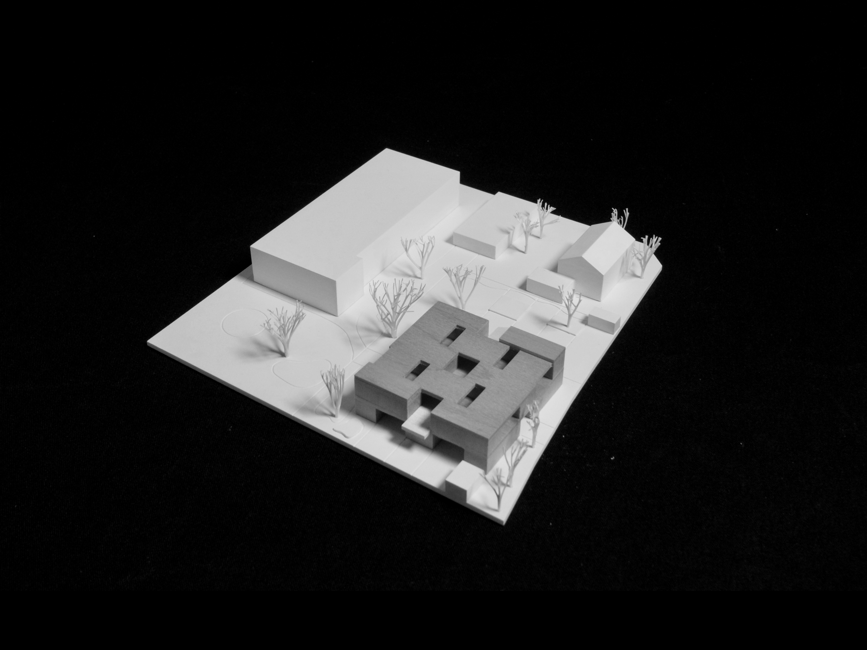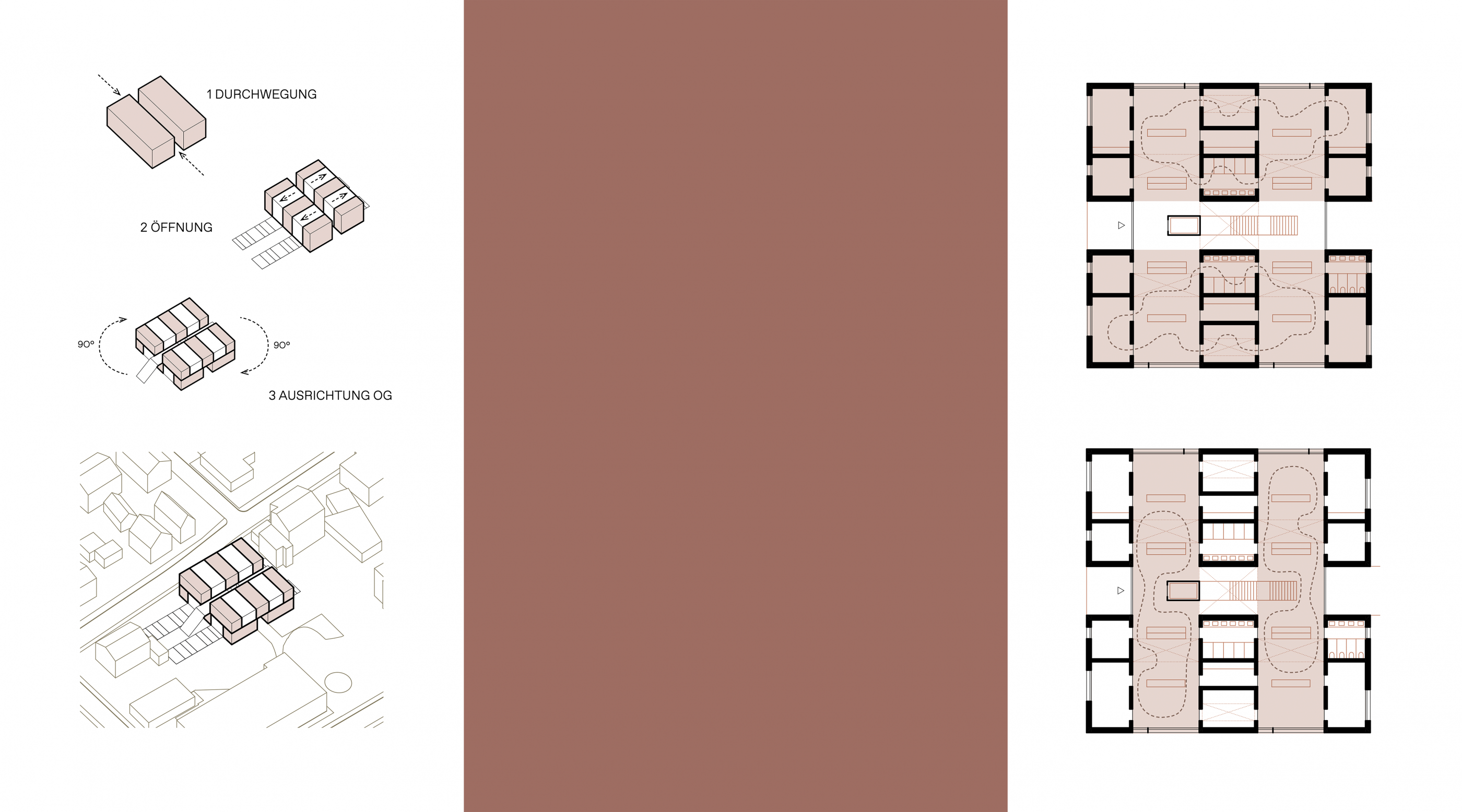 Zwei weitere Achsen prägen den Grundriss. Senkrecht zur Haupterschließung segmentieren sie das Volumen und erschließen die Nutzungseinheiten. Das „Haus aus Häusern“ bezieht sich damit auf die städtebauliche Körnung der Nachbarschaft, ohne seine Verwandtschaft mit Flachdach zu den umgebenden öffentlichen Gebäuden zu leugnen. Dank großzügiger Transparenz nach Innen und Außen entstehen grenzenlos fließende Räume.
