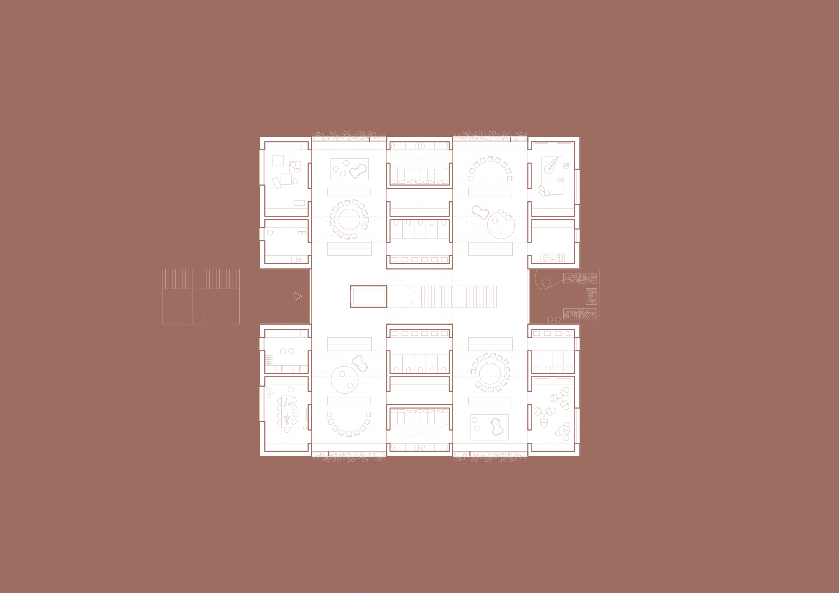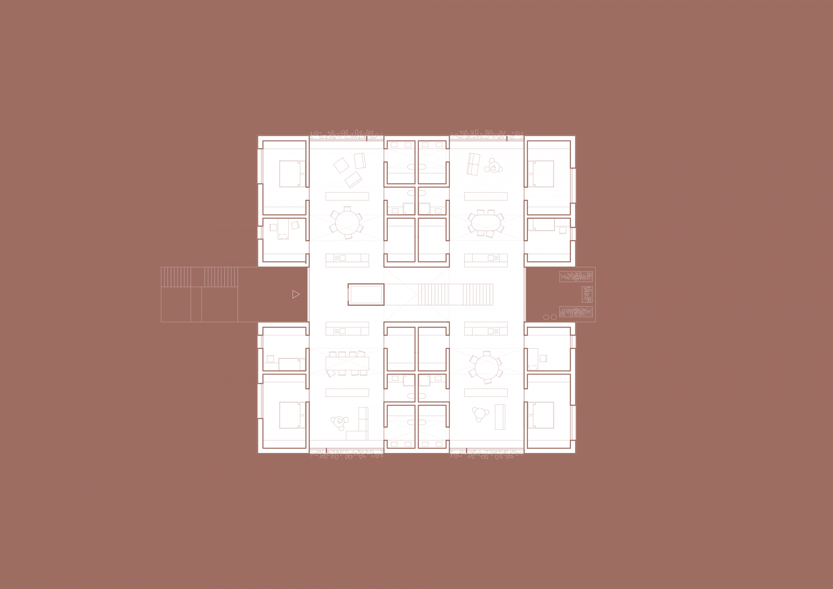 Zwei weitere Achsen prägen den Grundriss. Senkrecht zur Haupterschließung segmentieren sie das Volumen und erschließen die Nutzungseinheiten. Das „Haus aus Häusern“ bezieht sich damit auf die städtebauliche Körnung der Nachbarschaft, ohne seine Verwandtschaft mit Flachdach zu den umgebenden öffentlichen Gebäuden zu leugnen. Dank großzügiger Transparenz nach Innen und Außen entstehen grenzenlos fließende Räume.